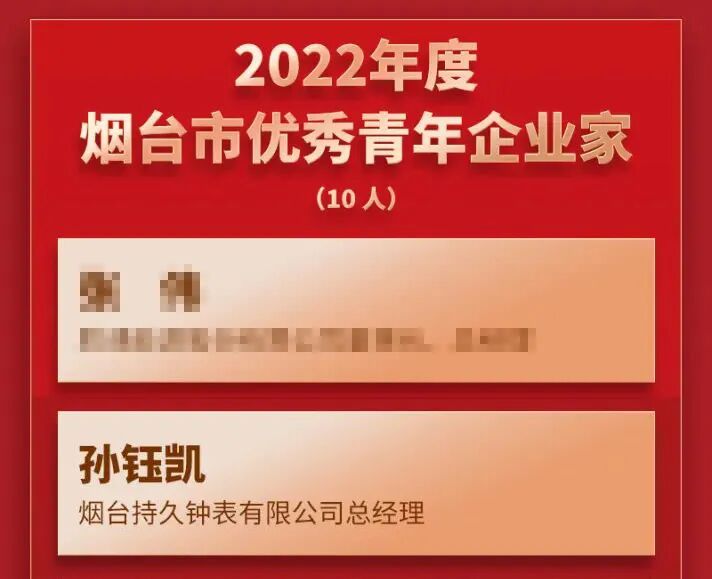 5月17日上午,“全市2022年工作总结暨优秀企业家表彰大会”隆重召开。山东省委常委、烟台市委书记江成出席大会并作重要讲话,市委副书记、市长郑德雁主持会议。大会对全市80名优秀企业家进行了表彰。烟台持久钟表集团总经理孙钰凯荣获“2022年度烟台市优秀青年企业家”称号。